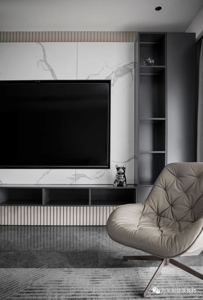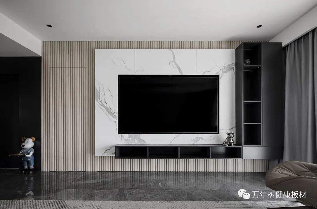 叠加一层皓白水磨石纹岩板作为电视背景