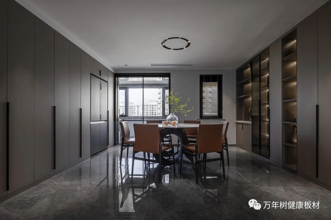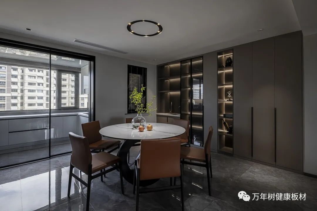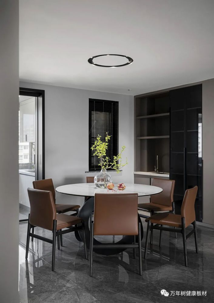 餐椅选用精工简约的暗木纹皮质靠背椅