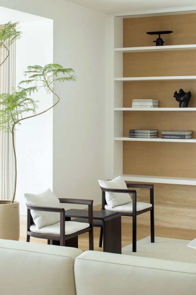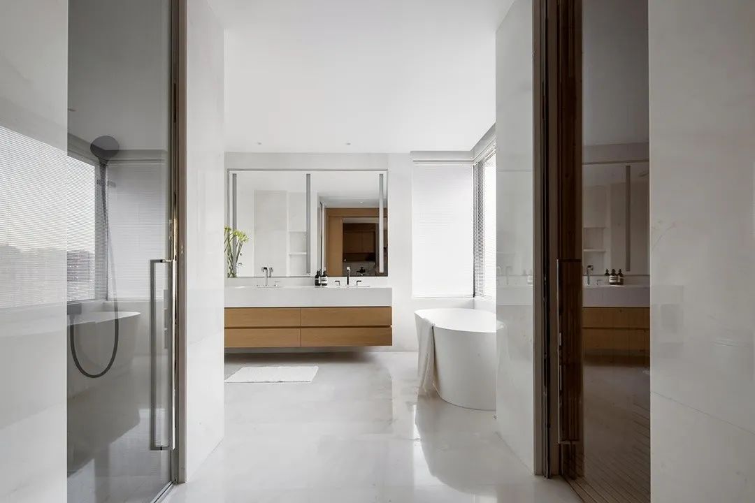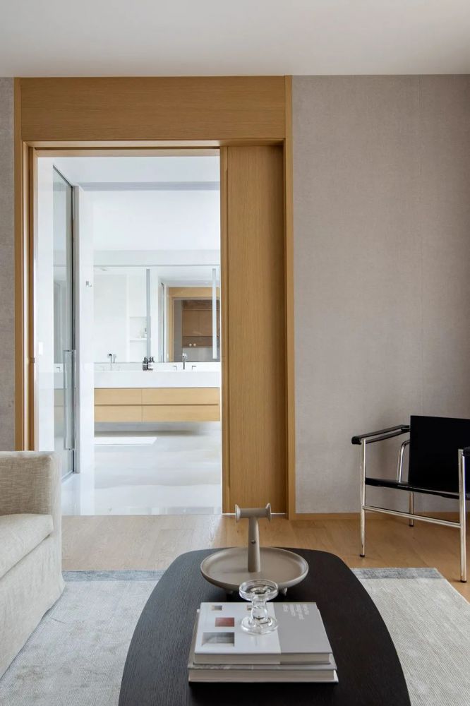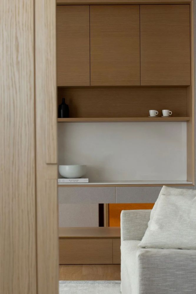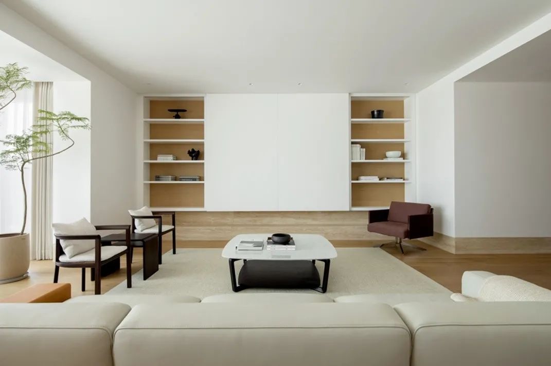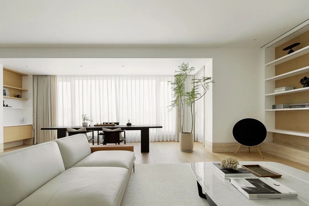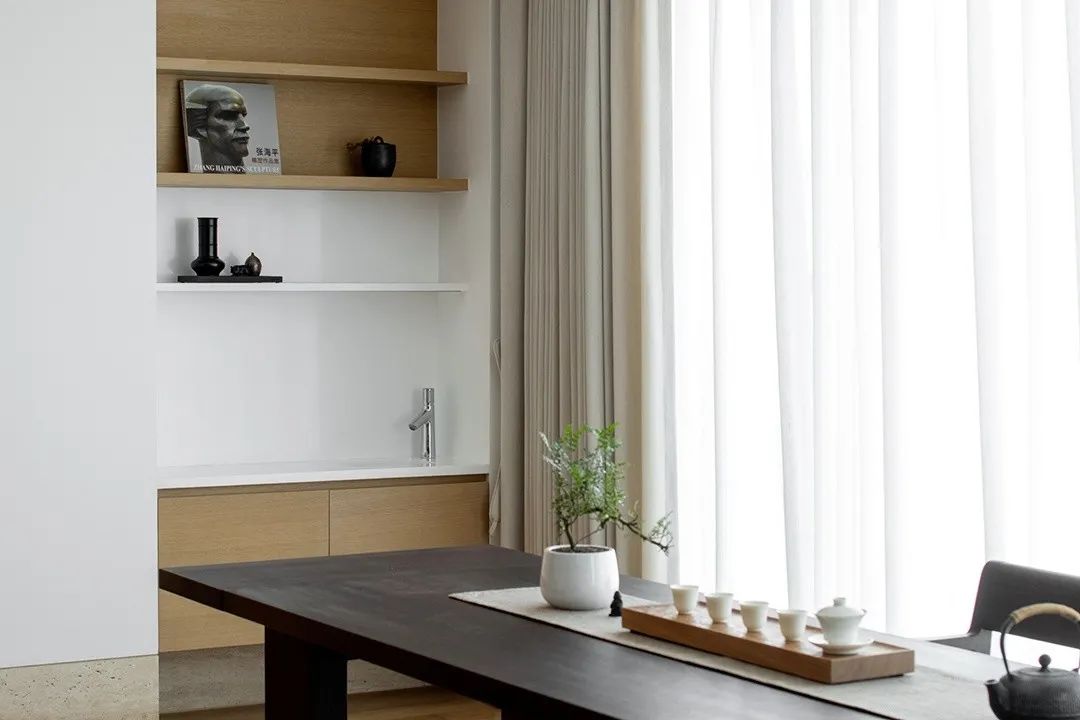 在私有场域中,功能空间的划分变得模糊,人在使用的过程中,不断弱化着区域间的界限。 在只维持必要的装饰之后,大面积的空间被留白,而正是这份留白给予了空间呼吸感与包容性,真正将空间让位于“人”,而非“物”。 在物资与信息都十分繁杂的当下,一处简单的素净的空间,反而能给人真正的放松,这便是家的意义所在。